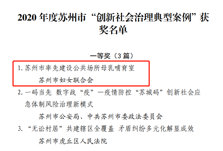 2020年度苏州市“创新社会治理典型案例”评选结果于近日出炉,YO米直播NBA最新消息“苏州市率先建设公共场所母乳哺育室”典型案例荣获全市一等奖!作为国际化城市和全国文明城市,加强对特定群体特别是母婴的关怀,是体现苏州城市人文关怀精神和城市文明程度的重要内容。自2016年起,苏州YO米直播NBA最新消息开始着手苏州市公共场所母乳哺育室建设工作,如今448个母乳哺育室站点,拼成一张“母爱地图”。这张“母爱地图”上母乳哺育室的标识越来越多,妈妈们在工作单位、商场或其他公共场所都能拥有一个安全、私密的空间给孩子喂奶,这份来自妇联“娘家人”的“礼物”,给了更多苏州女性实实在在的关爱和温情。