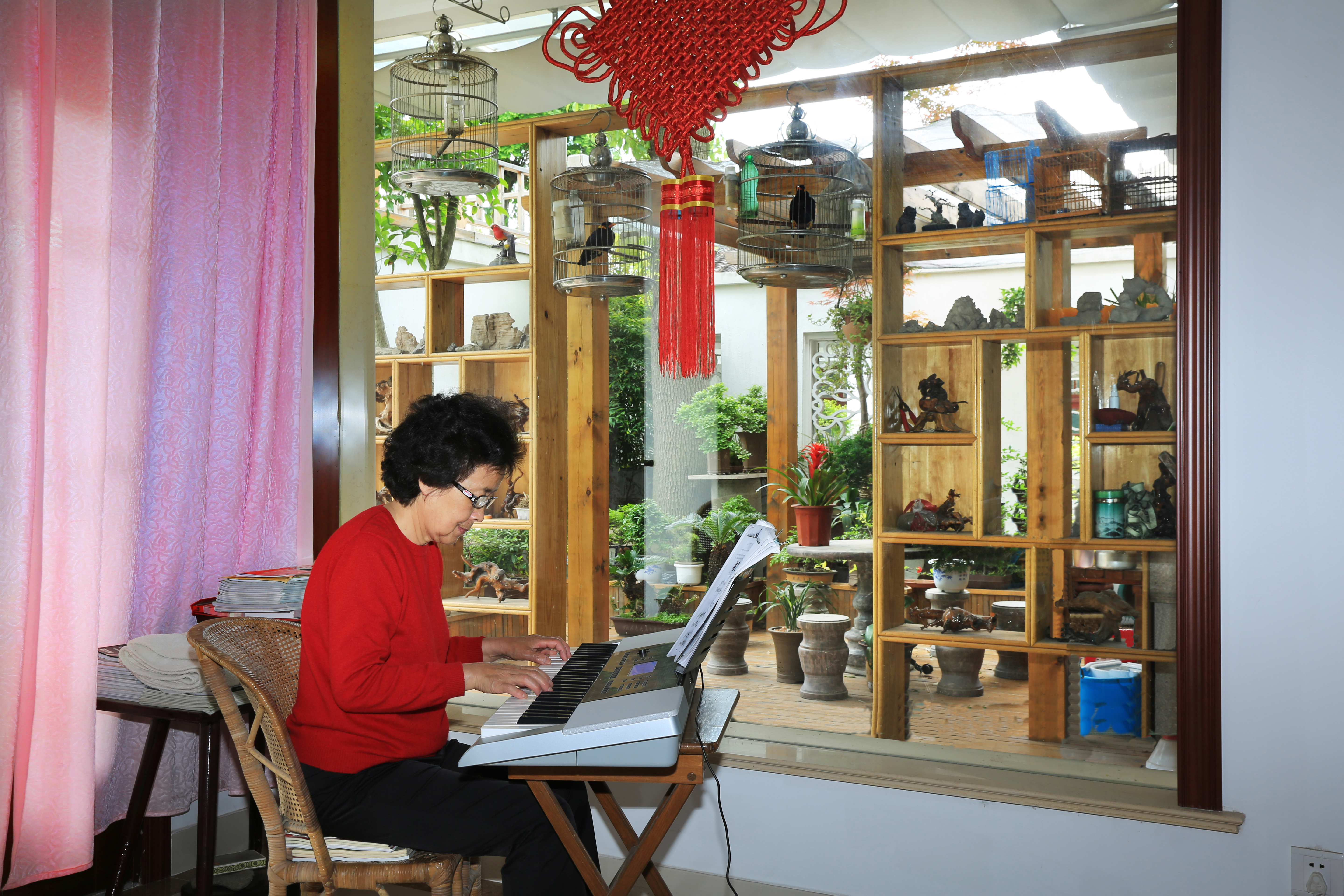 周原年轻时就爱好摄影和盆景艺术,庭院里摆放着他一手栽培的盆景,花木交错相应,廊间鸟笼参差,鸟鸣声悦耳不绝,置身其间仿佛来到了清新的自然天地,顿生心旷神怡之感。两百余盆盆景造型各异、郁郁葱葱,伴随着四季的变化,各色花卉轮番展示着每个季节所特有的韵味。典雅的家居环境和墙上悬挂的“文化之家”四个大字,清晰地透露出他们一家热爱自然、痴迷摄影、寄情文艺的风雅品性。